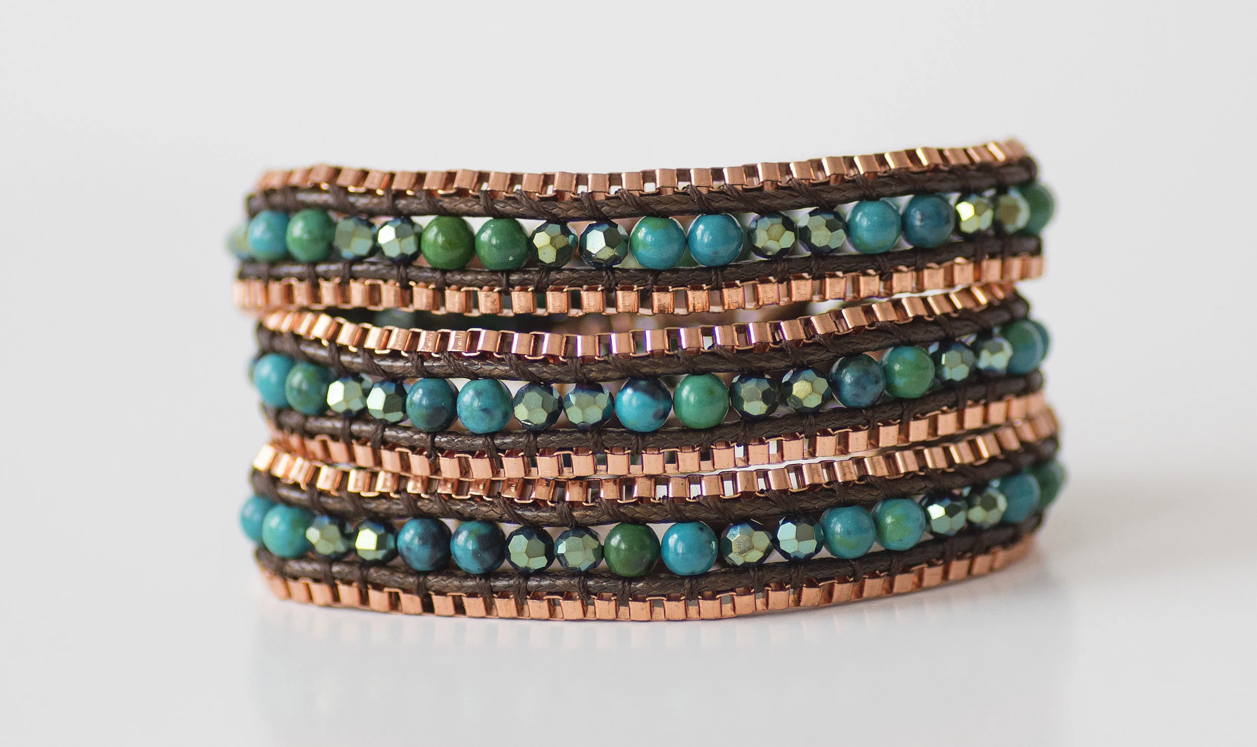 This bracelet wraps around a wrist three times and has one button clasp with four adjustable closures.